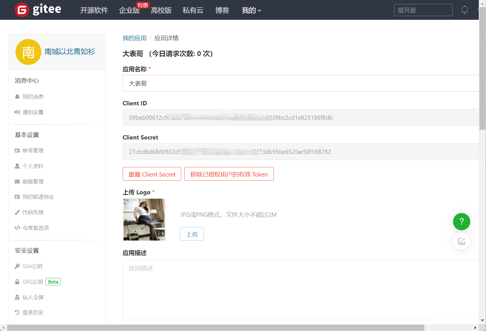 登录账号,访问https://gitee.com/oauth/applications,并创建应用。创建完成后效果如下:
