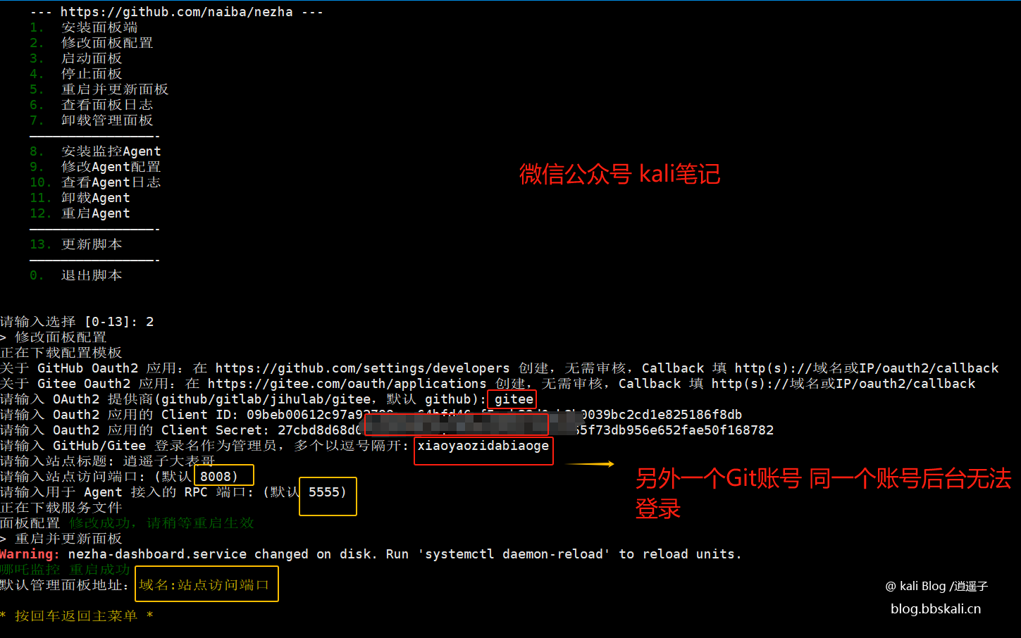 curl -L https://gitee.com/naibahq/nezha/raw/master/script/install.sh -o nezha.sh && chmod +x nezha.sh && sudo CN=true ./nezha.sh按照提示分别输入相应的信息。需要注意的是Gitee的登录账号为 账号B