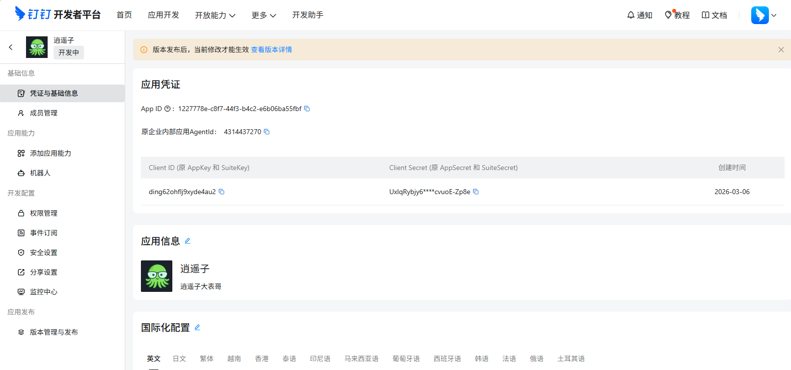 为了方便,你可以直接将钉钉应用的 Client ID和 Client Secret发给AI 让他自己完成配置。