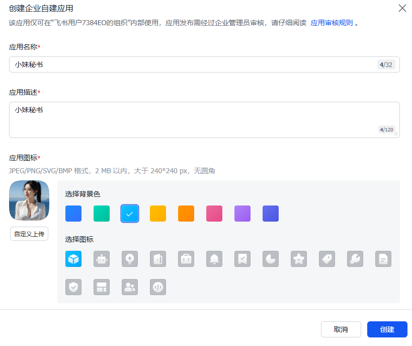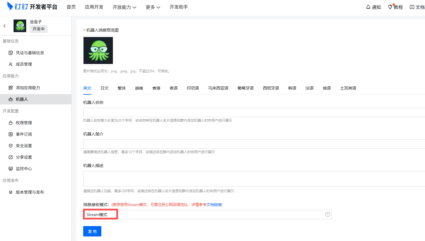 接下来,添加机器人,并配置机器人的基础信息。注意在:在“消息接收方式”里,选择 Stream 模式(流式接收)