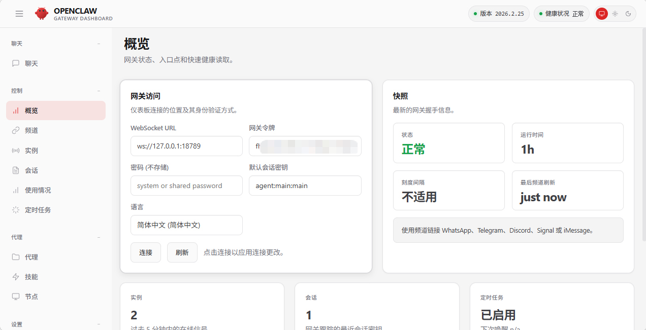现在,在浏览器中访问 127.0.0.1:18789/#token=你的值